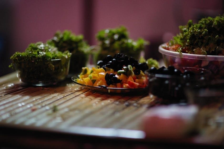 Low-calorie lunches and dinners on the Scarsdale Diet focus on lean proteins, vegetables, and minimal carbs. Lunch options include grilled chicken salads, turkey lettuce wraps, or tuna salad with cucumber slices. Dinners feature baked salmon with asparagus, shrimp stir-fries with zucchini, or roasted chicken with spinach. Vegetarian alternatives include tofu salads or lentil dishes. Portion control is key, and meals are designed to keep calories low while maintaining flavor and nutrition. These options align with the diet’s high-protein, low-carb approach, ensuring weight loss while providing essential nutrients. The emphasis is on fresh, wholesome ingredients to support overall health and energy levels throughout the day.