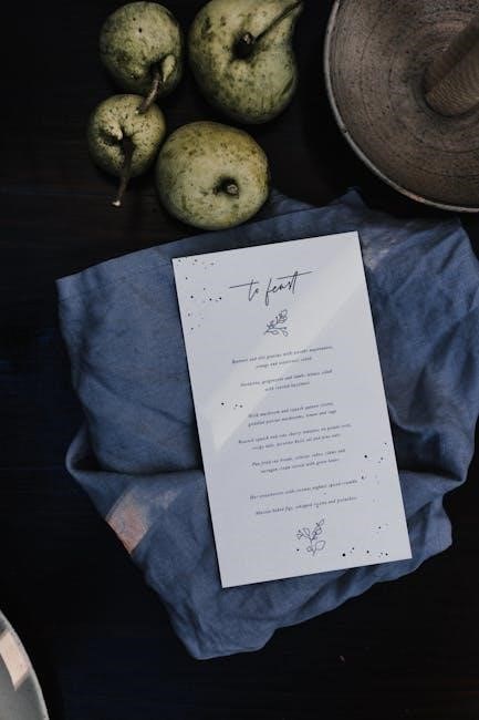 The Scarsdale Diet offers a structured 14-day menu plan with daily breakfast, lunch, and dinner options. Meals are designed around lean proteins, vegetables, and approved foods, ensuring variety and simplicity. Each day’s menu is carefully planned to promote weight loss while maintaining nutritional balance. The plan emphasizes whole foods, avoiding processed items, and provides clear portion guidance. This organized approach helps dieters stay on track and achieve their goals. A downloadable PDF version is available for easy reference, making it convenient to follow the plan consistently.